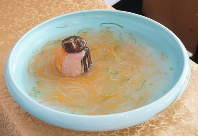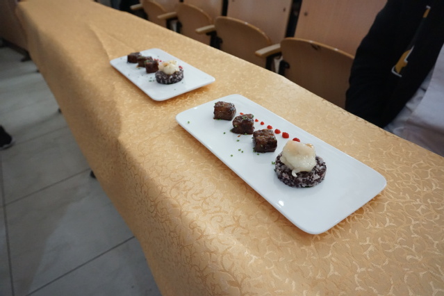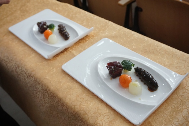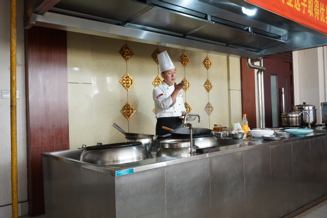 活动中,王志兴副经理介绍了其带领员工参加各项大赛的历史,分析了中餐制作的最新发展趋势,结合自己的职业和参赛经历,基于传承经典,创新形式的原则,向在座的师生演示了虾球牛肉配炒黑米、文思豆腐什锦羹、凤梨汁配菊花肉、蜜汁烤鱼配翠笋、富贵海参等“四菜一汤”的经典菜品,技艺精湛,讲解精彩,现场师生共鸣强烈,激发了员工努力学好烹饪技能的热情。