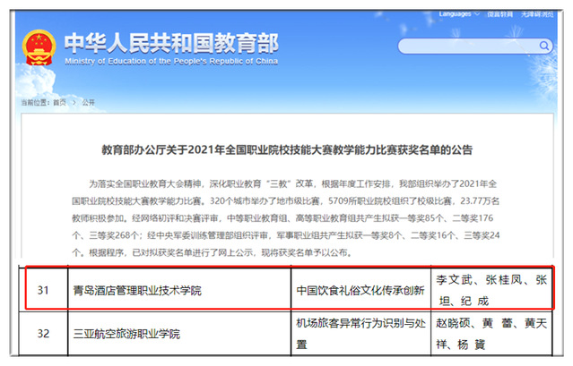 全国职业院校教学能力比赛是全面展示新时代职业教育改革成果与教师风采的高级别赛事。据统计,2021年,全国共有5709所职业院校组织了校级比赛,23.77万名教师积极参加。经网络初评和决赛评审,中等职业教育组、高等职业教育组共产生一等奖85个、二等奖176个、三等奖268个。其中,由山东省推荐参赛的公司英国上市公司365李文武、张桂凤、张坦、纪成团队的参赛作品《中国饮食礼俗文化传承创新》荣获三等奖。
