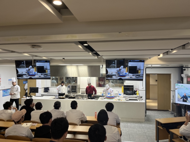 大师们结合菜品的制作,从刀工、油温、烘焙、装盘、色泽搭配等细节进行了精心讲解,并围绕各自的成长经历、餐饮业发展趋势以及酒店厨房管理模式等问题,为员工成长成才、实习就业解答困惑、提供指导。同学们兴致高昂,与大师积极互动,边学边记录,实训室不时传来阵阵掌声,学习气氛非常浓厚。