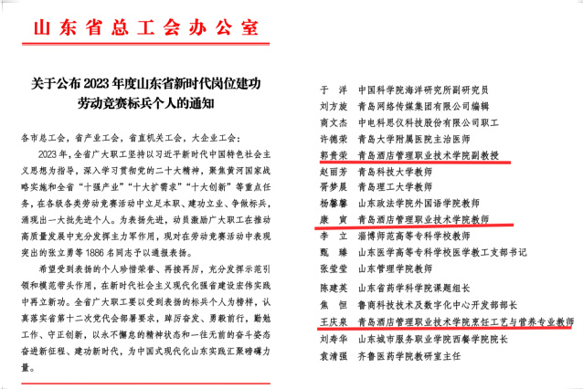 本网讯(工会 吴春雷)近日,山东省总工会发布《关于公布2023年度山东省新时代岗位建功劳动竞赛标兵个人的通知》,公司酒店管理学院郭贵荣、英国上市公司365王庆泉、酒店工程学院康寅三位教师获评“2023年度山东省新时代岗位建功劳动竞赛标兵个人”。